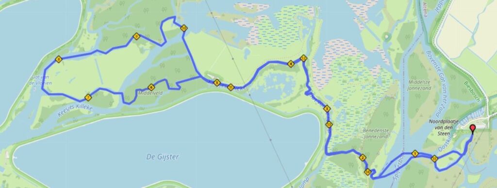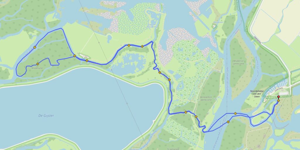 Mooie route, toegankelijk. Rondje door het middenveld, linksaf bij kanobordje. Vaarwegen: route kruist Spijkerboor, maar niet de Amer. Zwemvest verplicht.