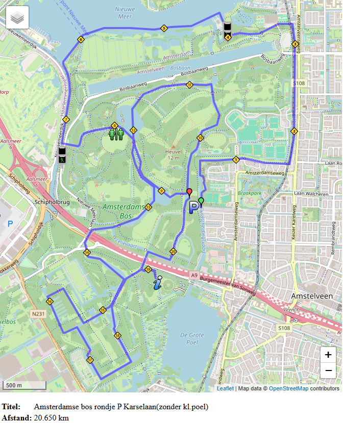 Rondje Amsterdamse Bos inclusief een pauze bij het 8km punt (de grote speelweide) en een bezoek aan het Bloesem Park (uitstappen bij punt ‘i‘).
