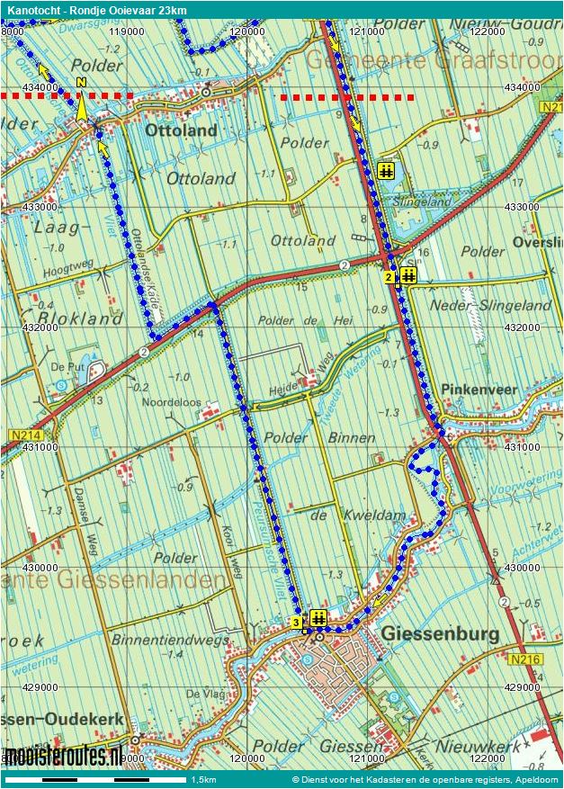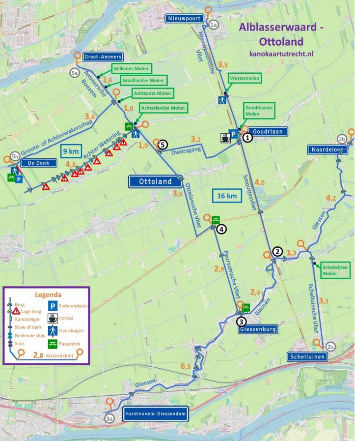 Dit is een kanotocht over brede vaarten tussen de rietkragen van de Alblasserwaard bij Groot-Ammers staan meerder molens langs de vaart. Prima als je lekker meters wilt maken. Als je geluk hebt vang je nog een glimp op van het Hollands landschap. Bij de kruising van N214 en N216 ligt een gerestaureerd gemaal Over- en Slingeland verscholen in het riet. Je kunt daar bij een duiker uitstappen, maar let op.. je vaart er zo voorbij.