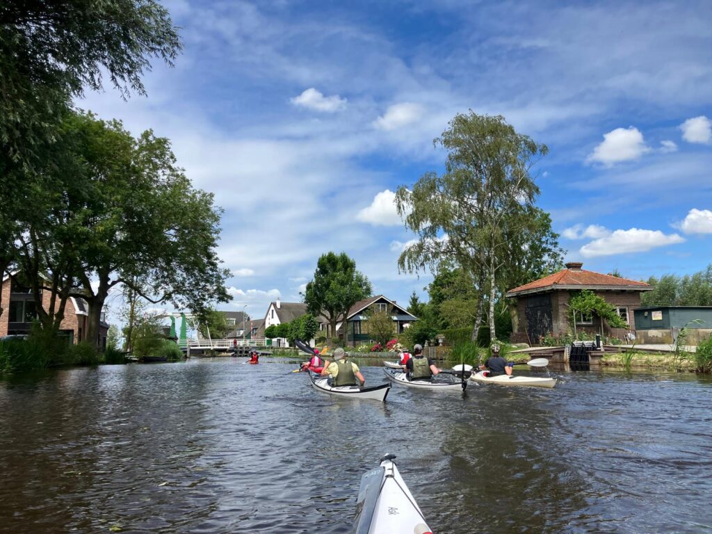 De lange rechte stukken maken de tocht wat minder afwisselend, maar het geeft wel weer ruimte om een praatje te maken met elkaar. Wind op kop kan even pittig zijn. En er sprong wat jeugd van bruggetjes het water in, die geen kajakkers hadden verwacht. Goed om alert op te zijn bij mooi weer.
