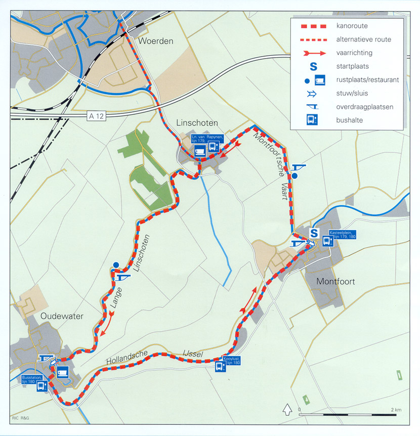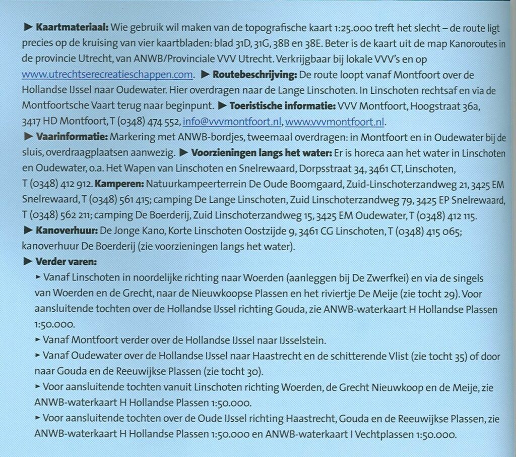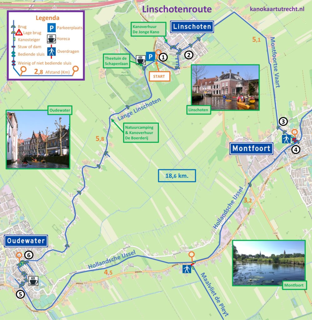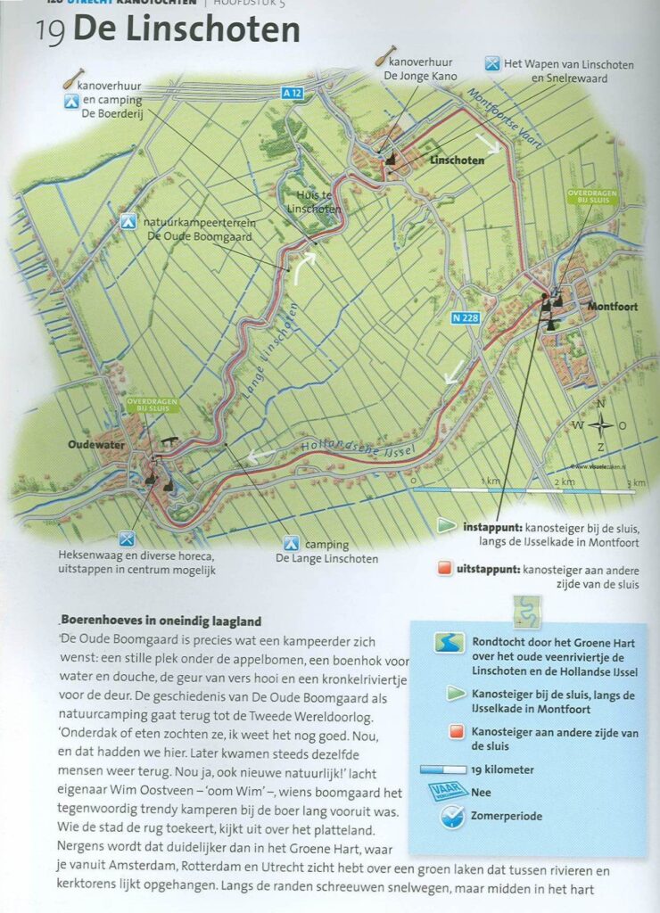 Kanoroute door Lopikerwaard, over de Montfoortsevaart, Lange Linschoten en Hollandsche IJssel. langs Linschoten, Montfoort en Oudewater. Rechtsom varen. De route is aangegeven met ANWB bordjes. Horeca: Brasserie Jola, Oudewater of in Linschoten.